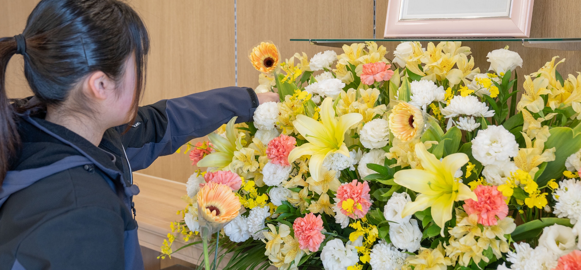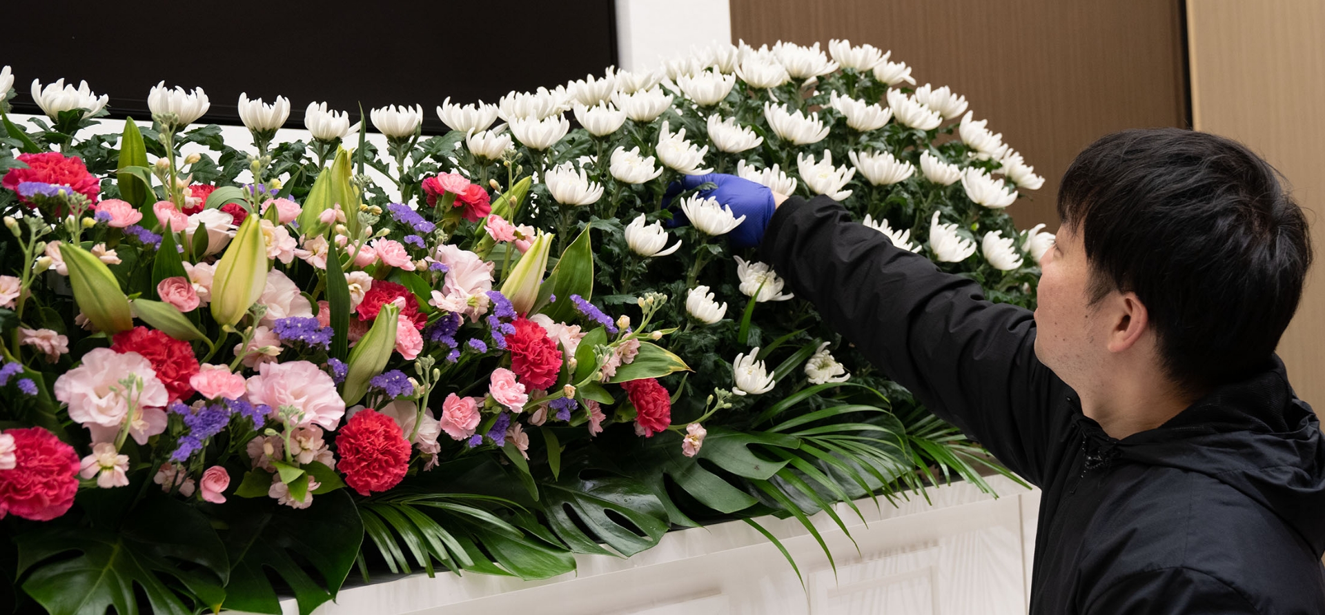 例えばご葬儀。思い浮かべられるような真っ白な壇上も、色とりどりの彩られた鮮やかな祭壇も、一輪一輪をもちろん人の手で差して大きな祭壇を作ることで、人の人生の壮大さとお見送りすることの荘厳さを表現する業務です。日々に行われ、ただ一つとして同じものはない。生き生きとしたたくさんのお花を使って、場に生命力と静けさを与える大切な業務です。