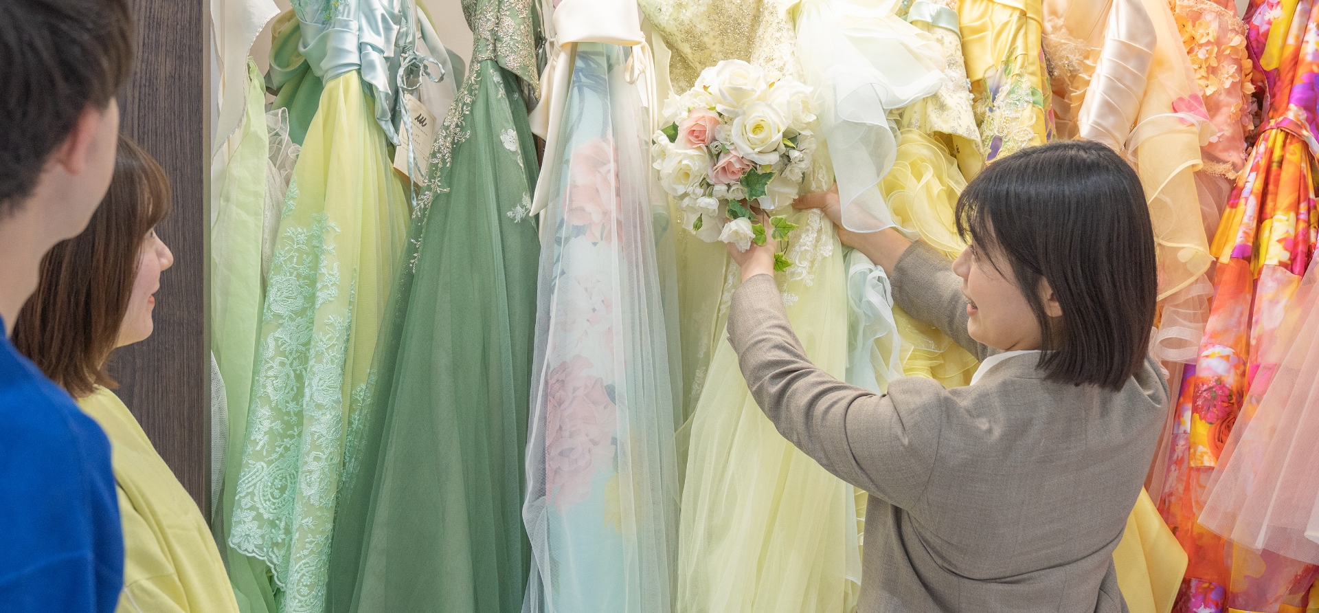 打ち合わせを重ね、ドレス選びと共にお花をコーディネートすること。新郎新婦の思いを形にする喜びを感じる、お花を通じて心に寄り添うことのうれしさを感じる業務です。