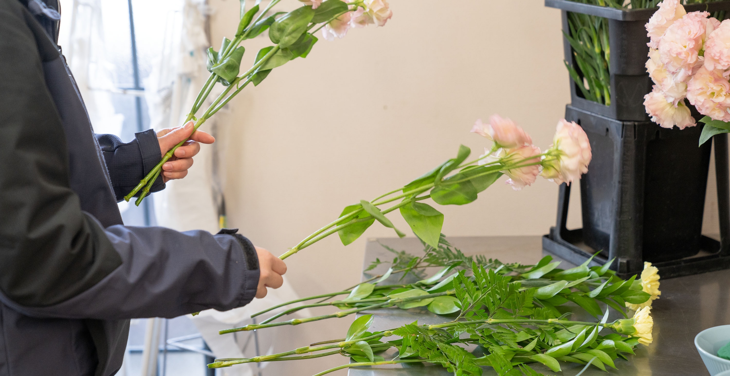 フラワーライフは、まず「生花」という生き物を扱う仕事です。同時にそれをどのようにお客様にお届けできるか・お喜びいただけるかを日々考え、実現する仕事です。